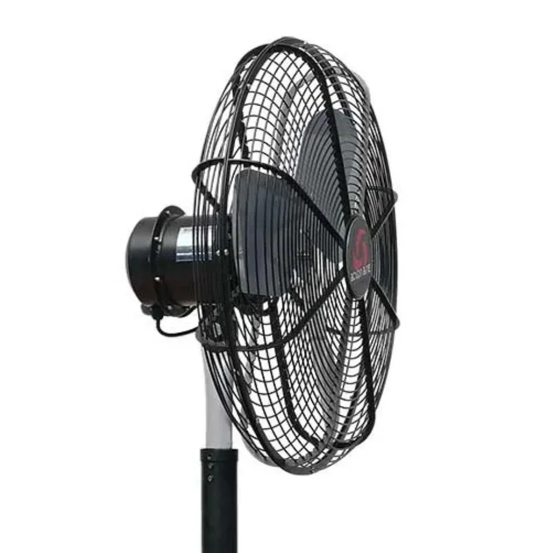 Heavy duty pedestal fan with water shield protection, offering flexible placement in wet or humid industrial environments.
